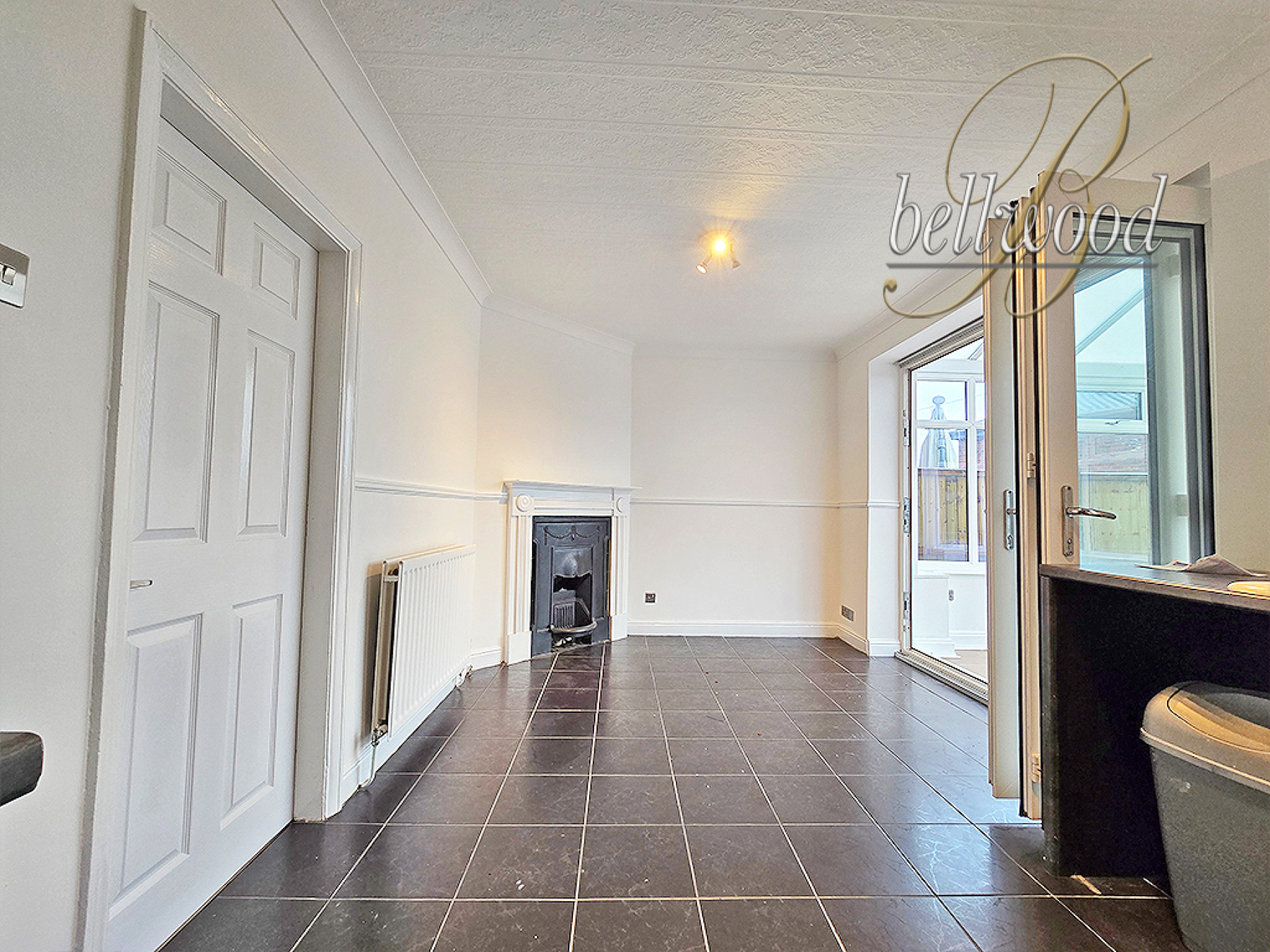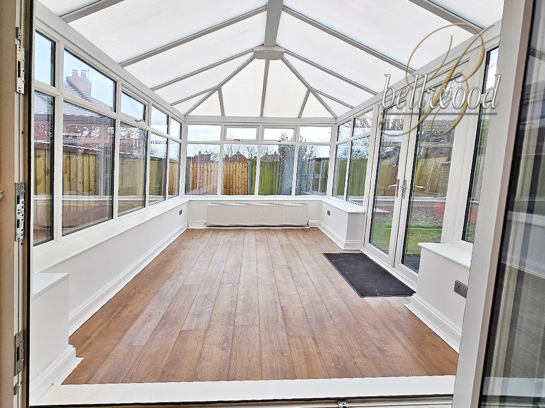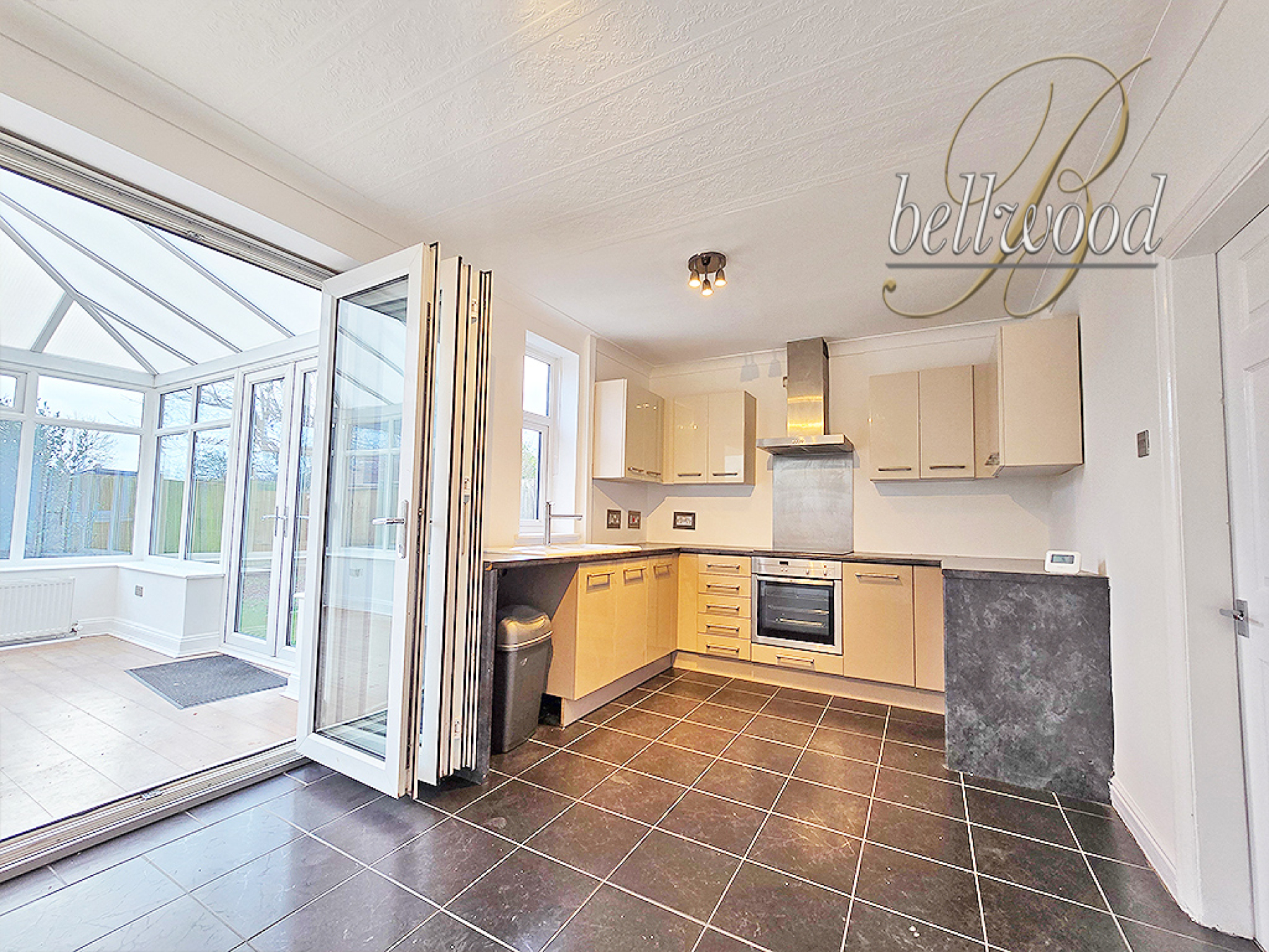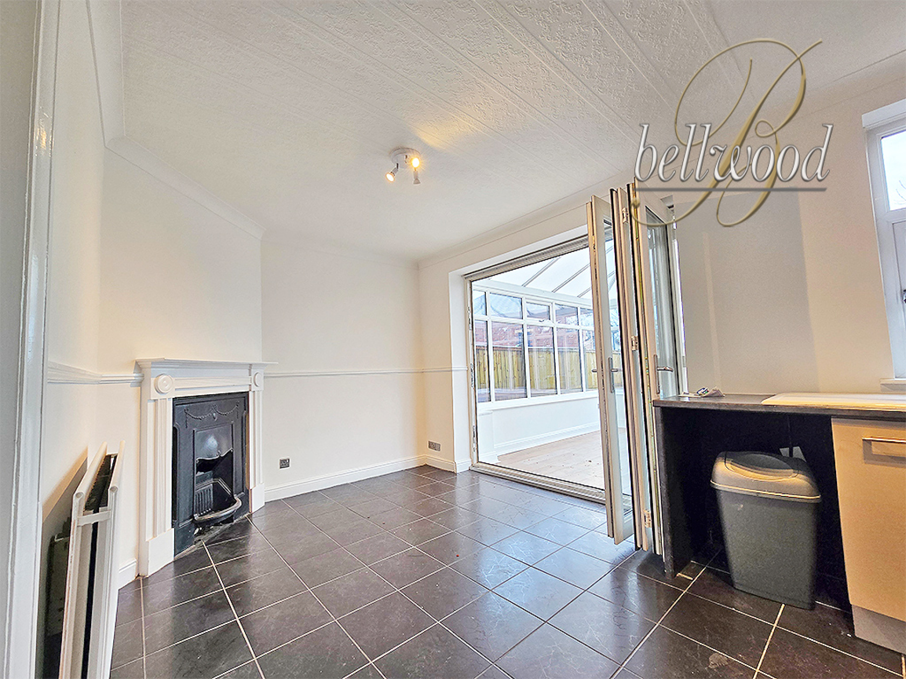 Sleek fitted units provide plenty of storage, complemented by an integrated oven and hob, with additional space available for two under-counter appliances. The open-plan layout continues into the dining area, where a charming decorative fireplace adds to the character of the space. Bi-folding doors lead into the conservatory; a versatile additional living area filled with natural light and offering a seamless connection to the rear garden.