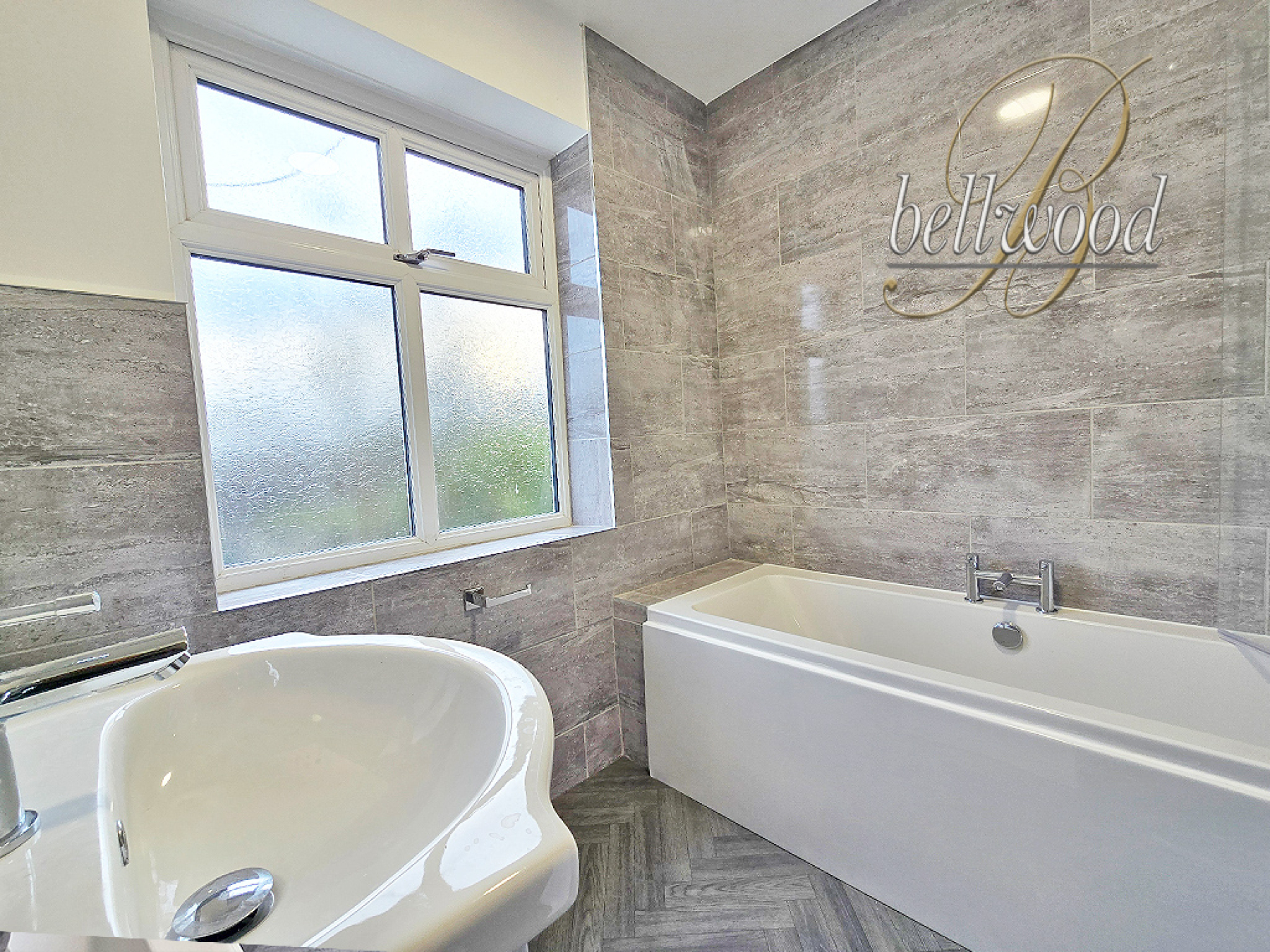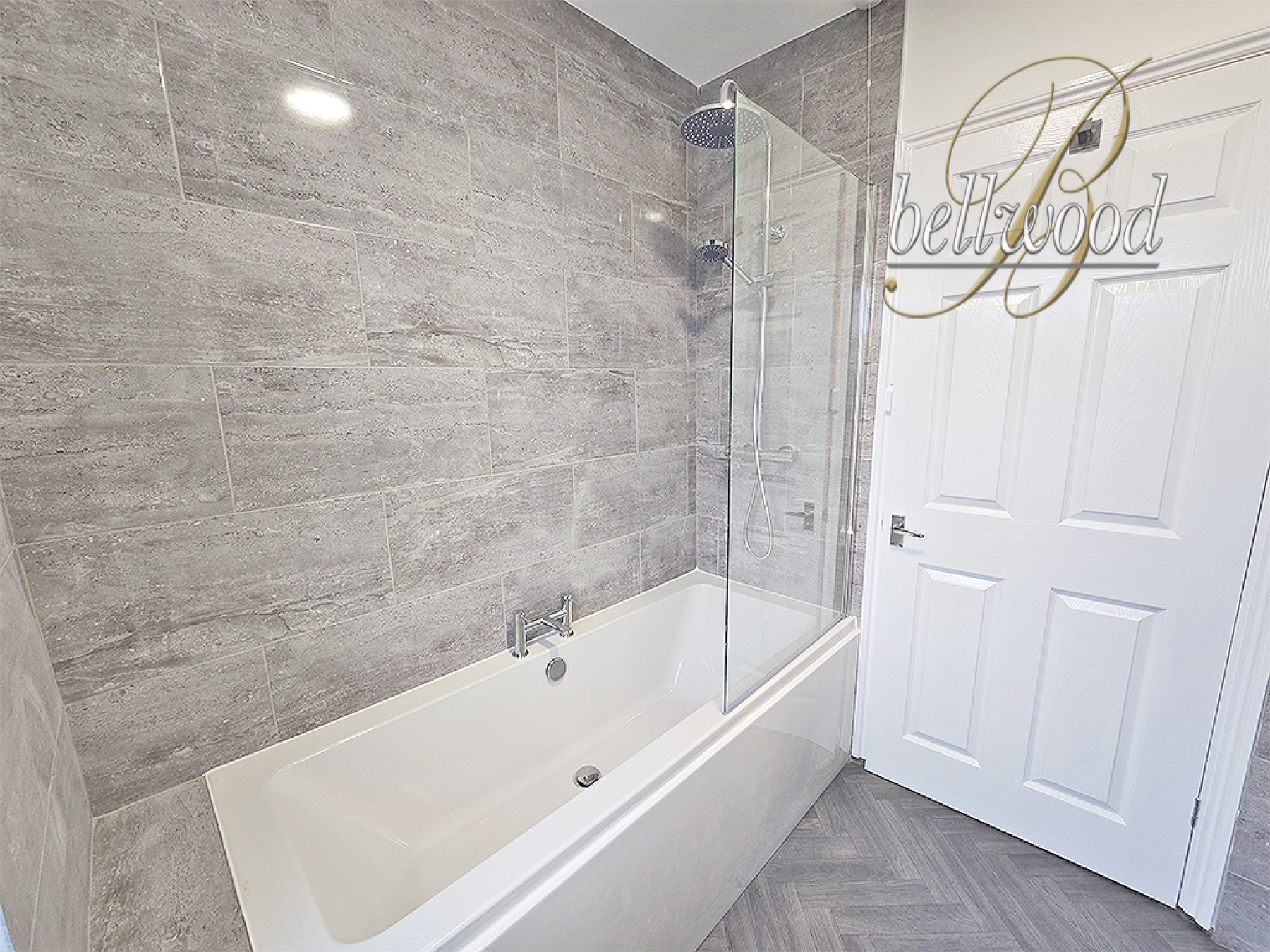 Upstairs, the property offers three well-proportioned bedrooms, each neutrally decorated and filled with natural light. The master bedroom benefits from a large bay window, enhancing the sense of space, while the second bedroom enjoys peaceful views over the garden. The third bedroom is a comfortable single room, ideal for use as a child’s bedroom, home office, or additional storage space. The brand new, contemporary family bathroom is finished to a very high standard, featuring modern tiling, bathtub with shower screen, and an overhead shower.